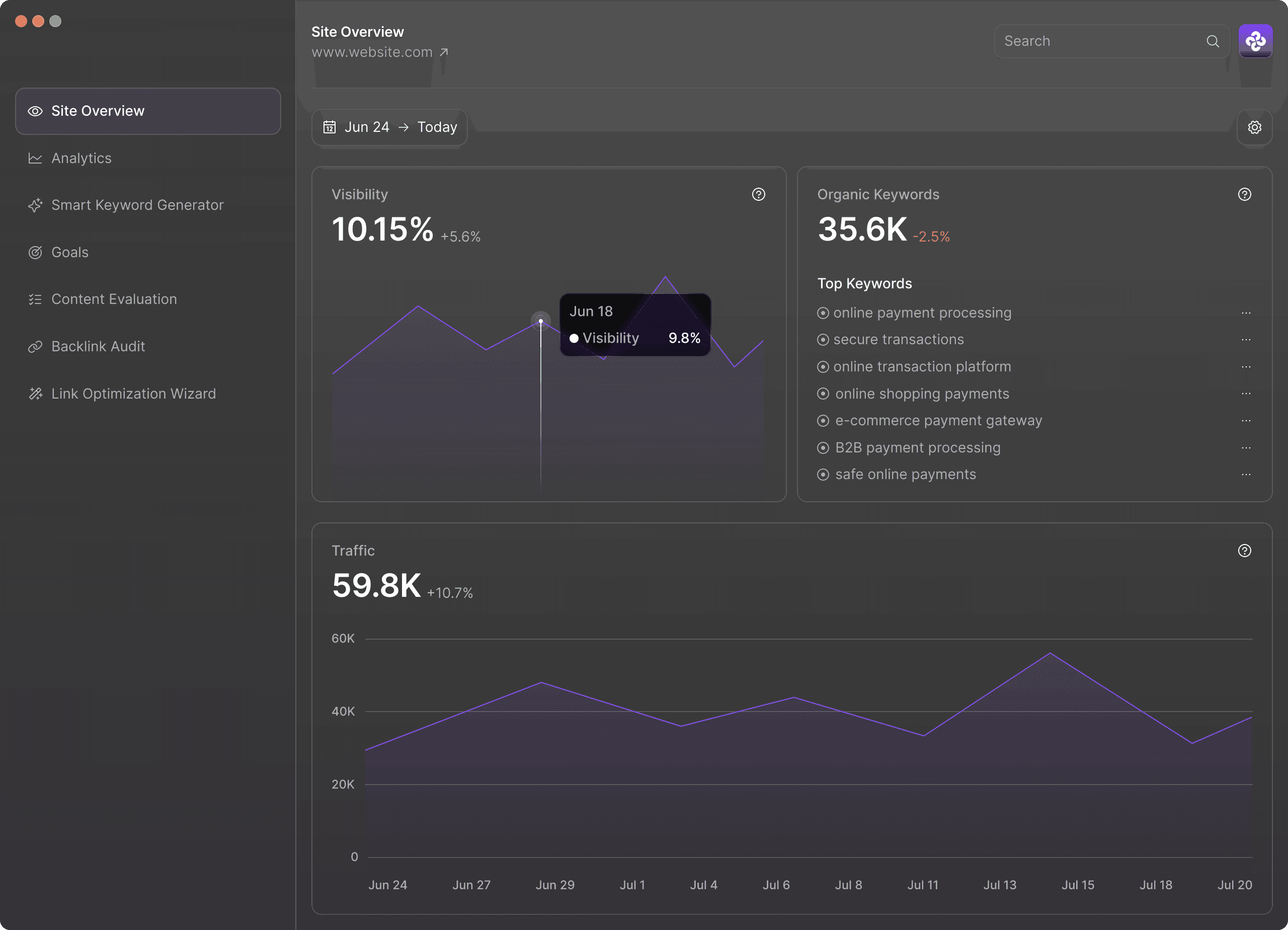 Helps you set and achieve SEO goals with guided assistance.